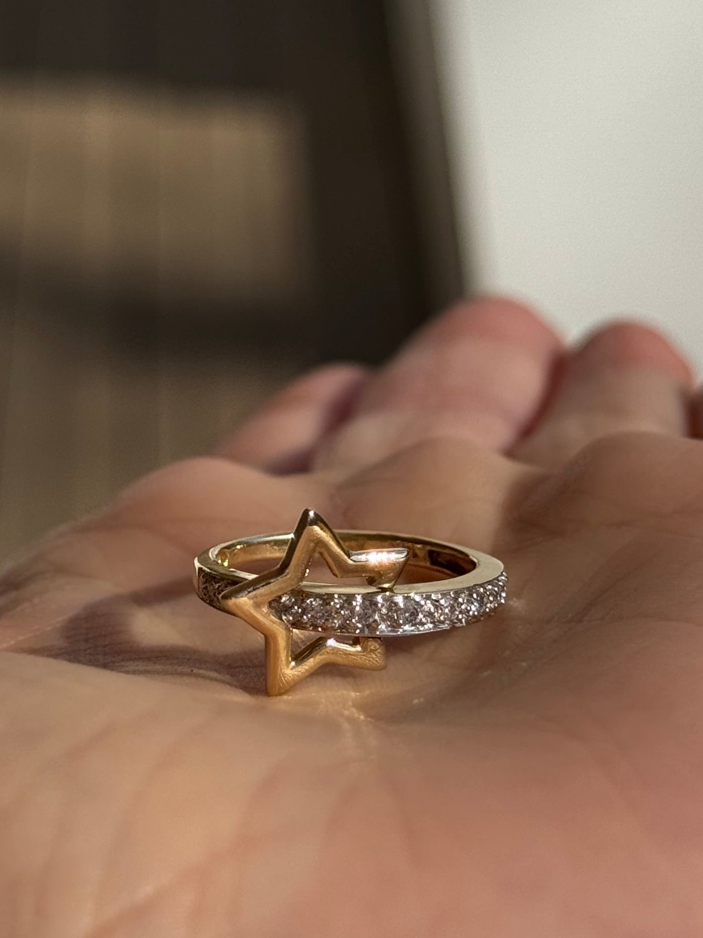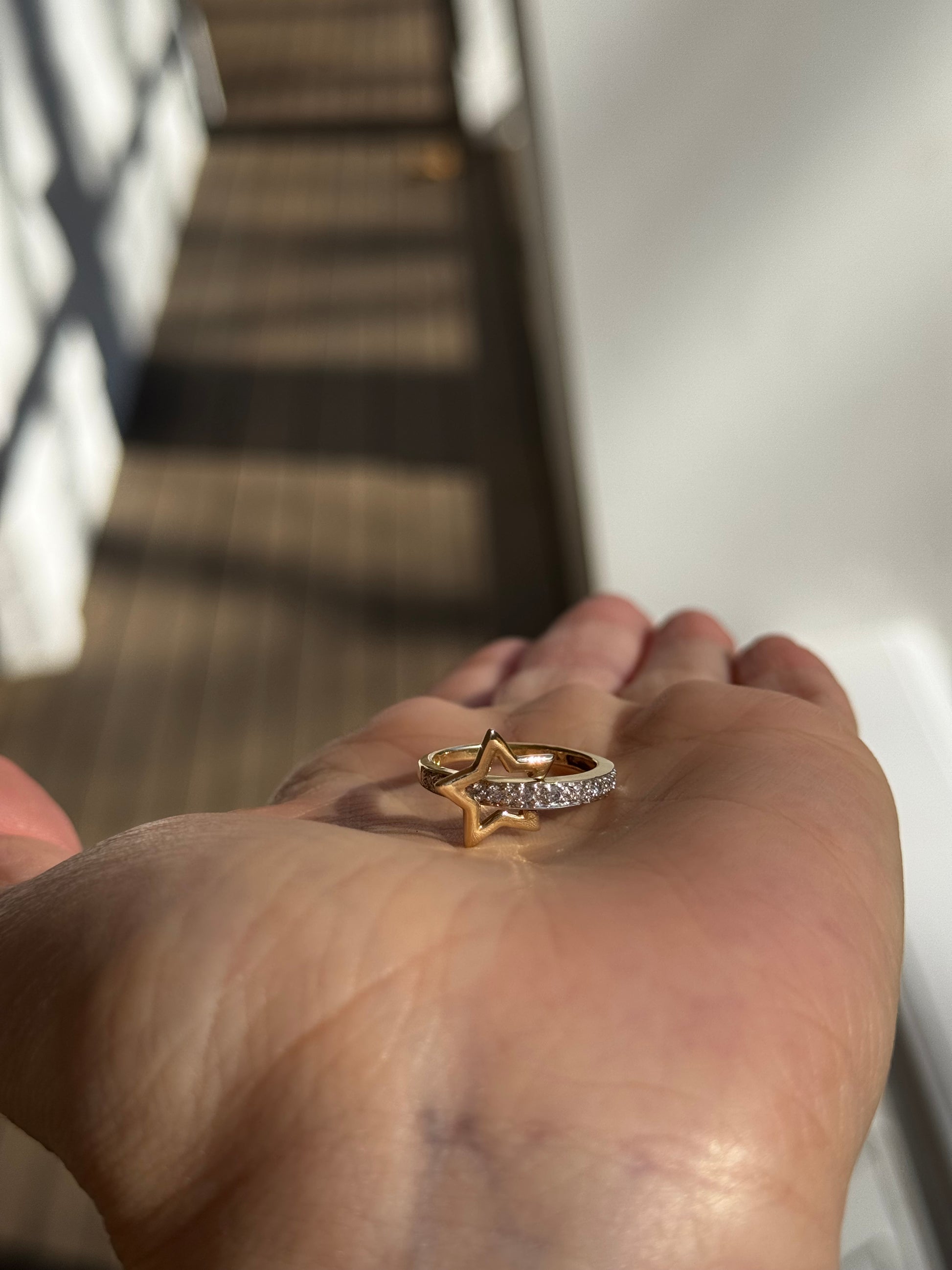This is a 14k yellow gold sparky diamond band with an articulating cut out star. The star flips east to west with sparkly round diamonds running through it. This ring is sizable.