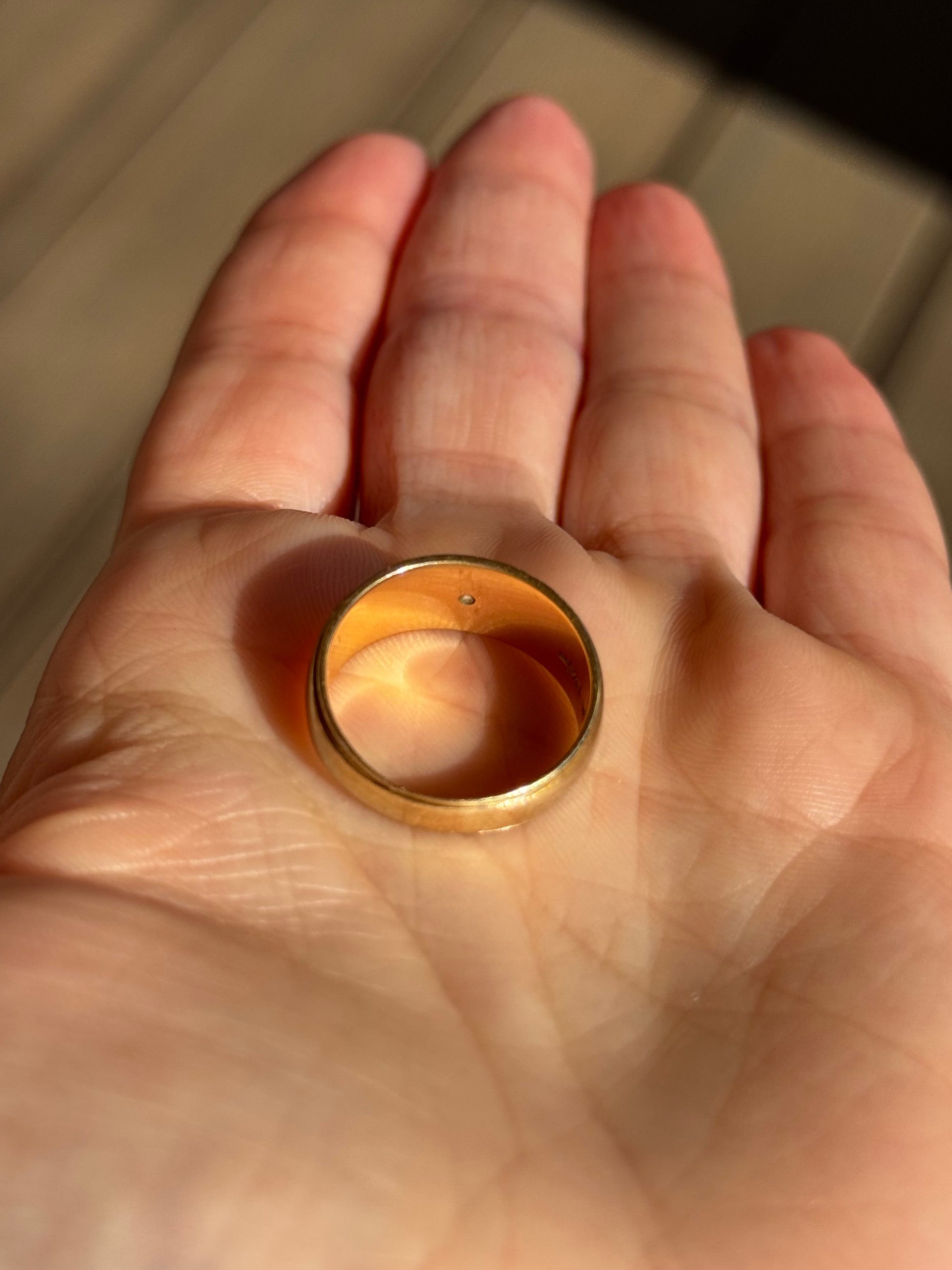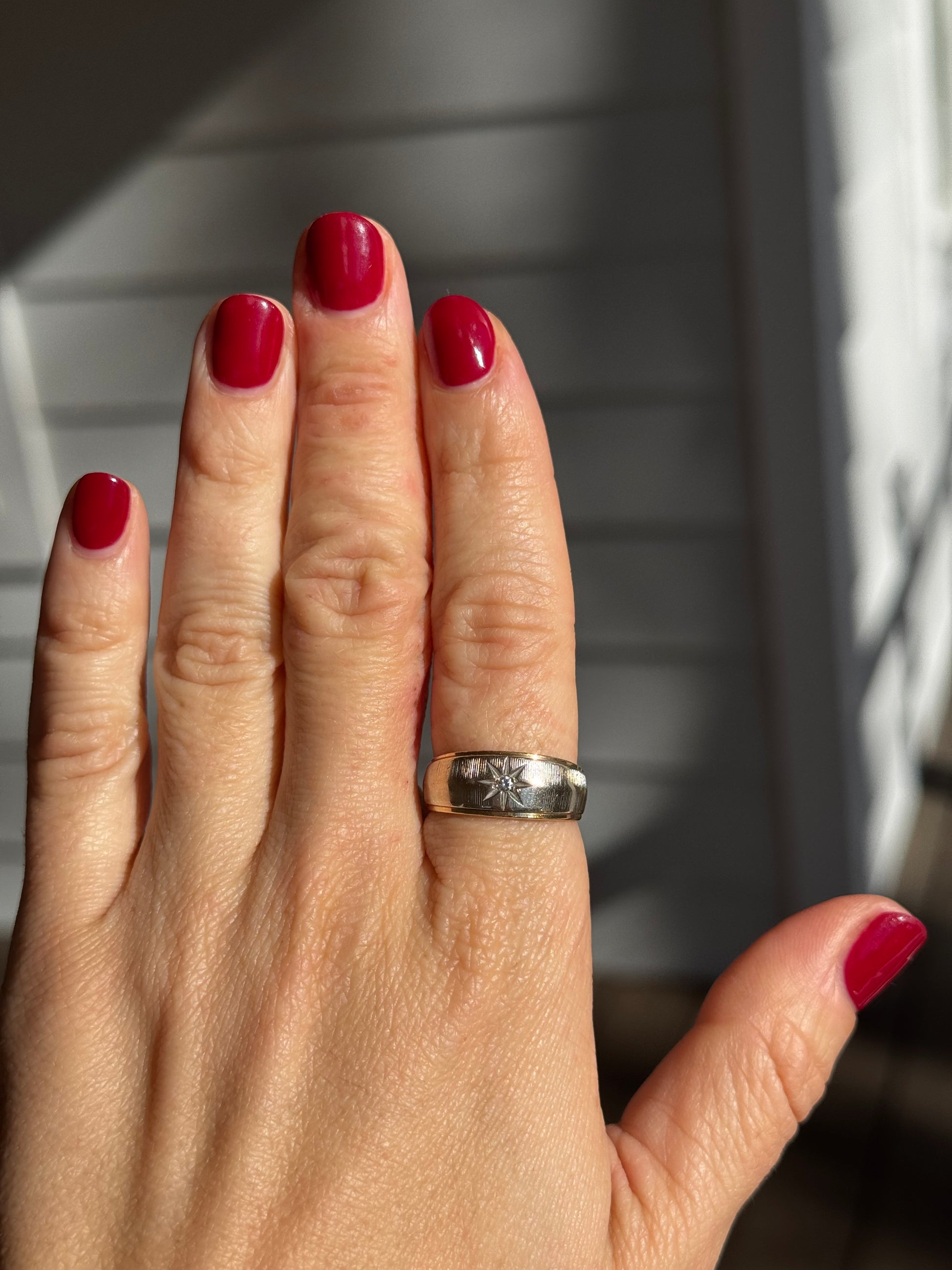 This is a vintage 14K two tone white gold and yellow gold band with a small startset diamond in the center. The width of the band graduates from wider on the top to more narrow at the bottom. There is subtle texturing to the white gold part of the band.